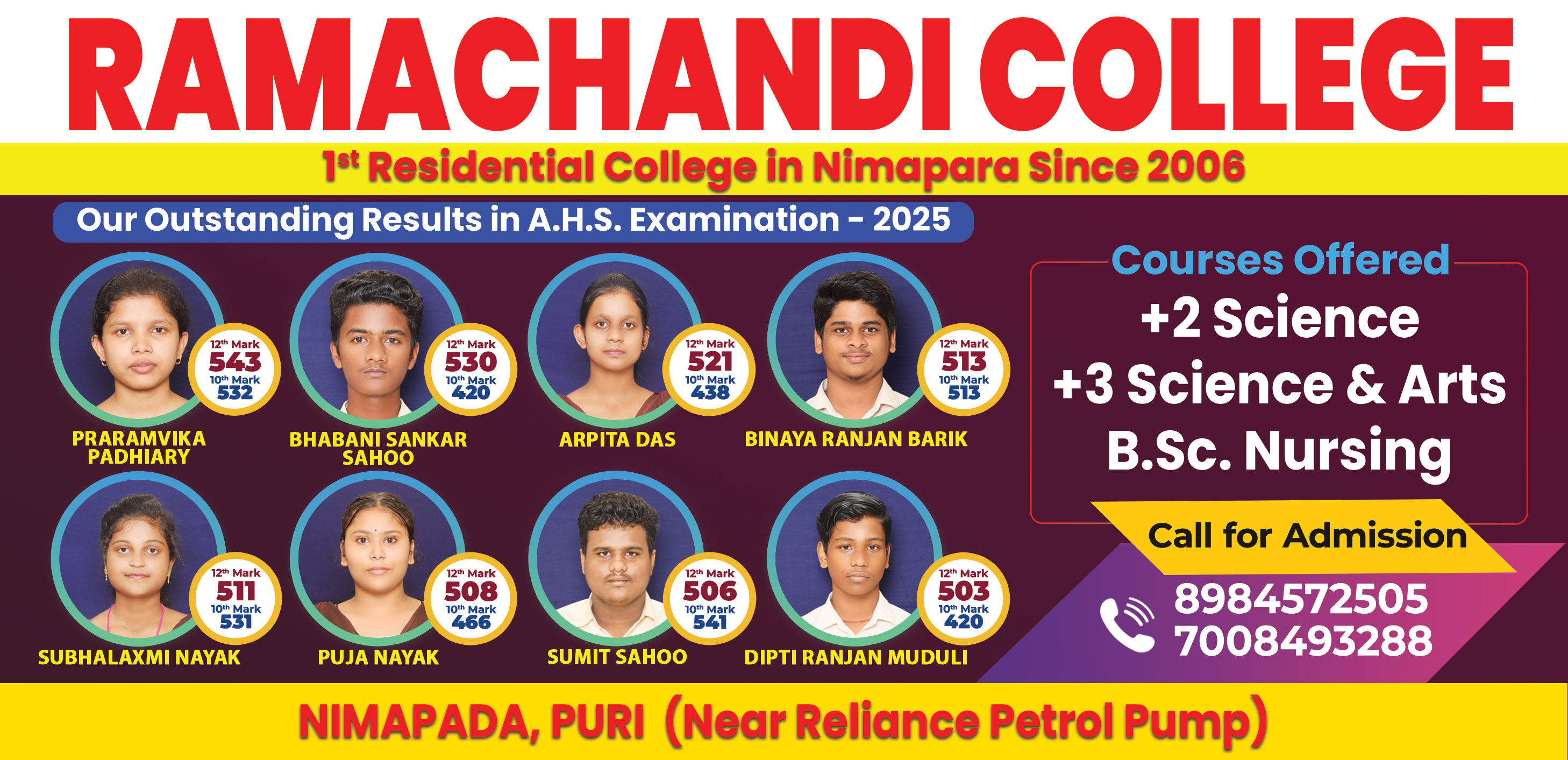 Ramachandi Group of Institutions have two institutions under them, one +2 COLLEGE RAMACHANDI SCIENCE RES. HIGHER SECONDARY SCHOOL, AMBADIHA, KHURDA and one +3 COLLEGE INSTITUTE OF TECHNOLOGY AND MANAGEMENT STUDIES, NIMAPADA, PURI. The mission of Ramachandi Group of Institutions is to promote educational excellence, personal responsibility, and balanced growth: There by helping students discover and develop their talents to best of their ability and surge ahead to greater heights.